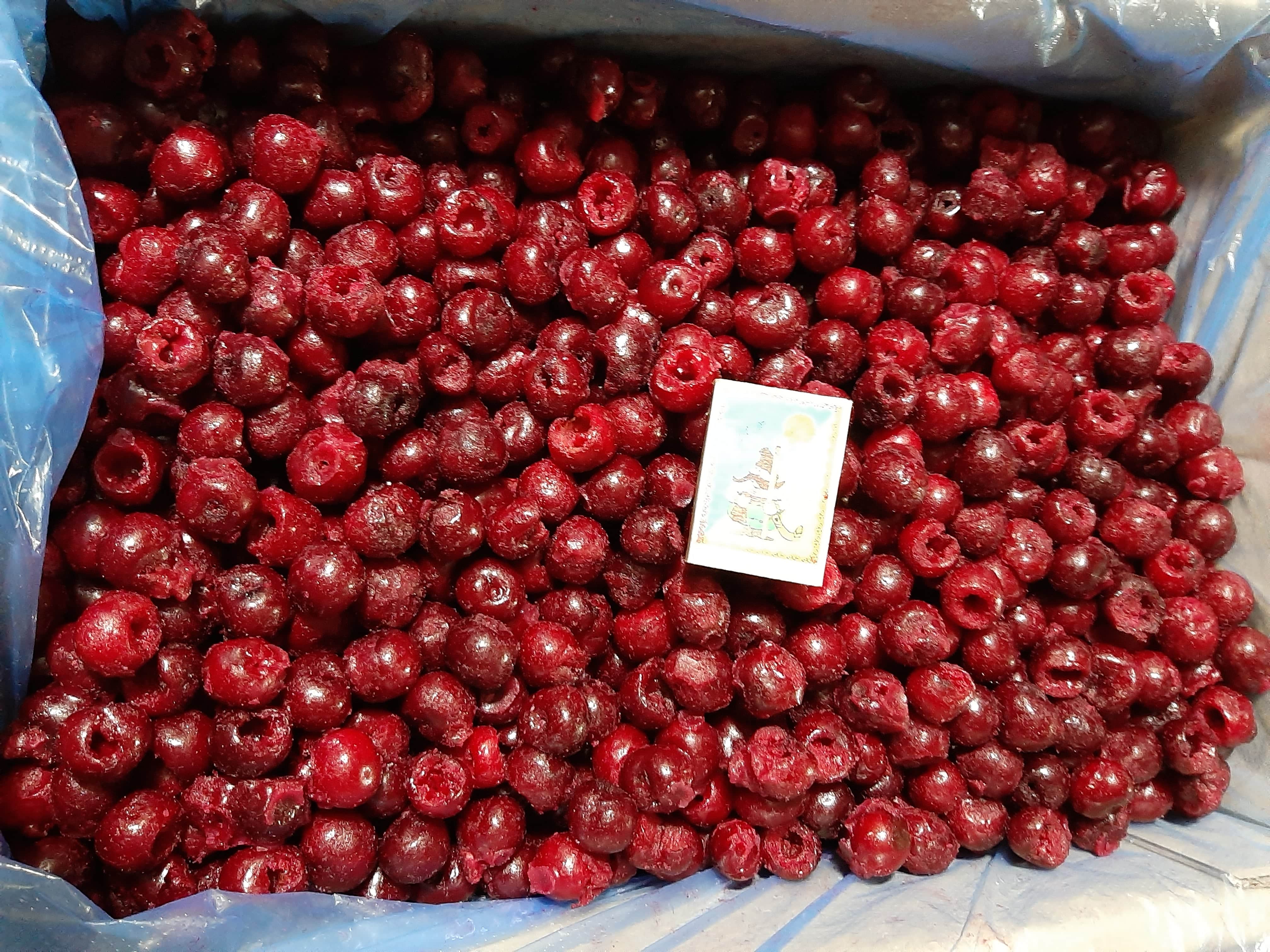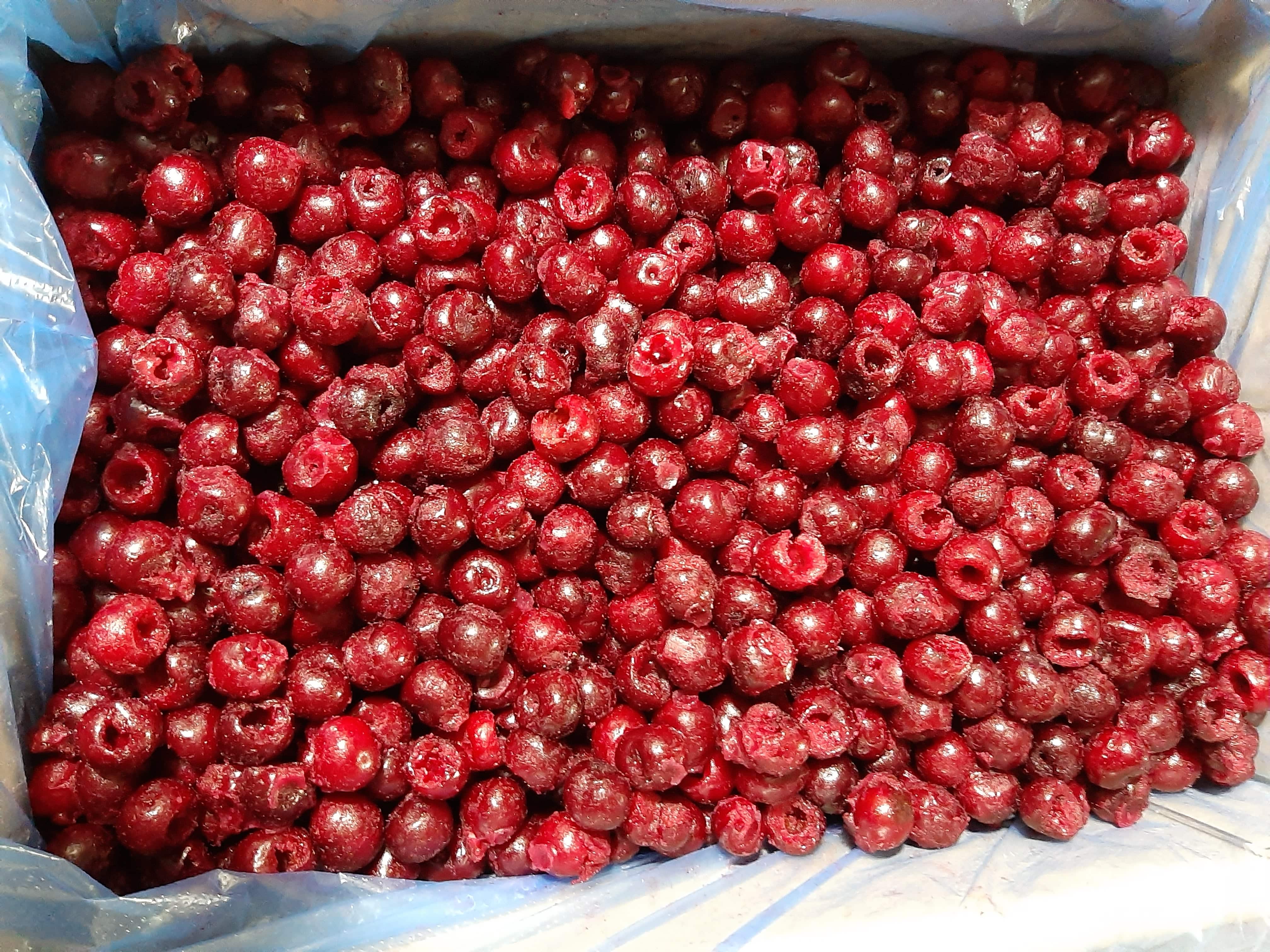 IQF frozen sour cherries for industrial processing and export. Pitted cherries with rich color, tangy flavor, and juicy texture preserved.